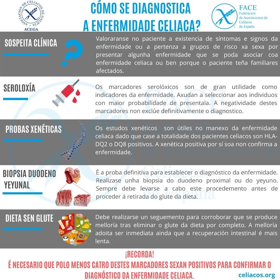 Mediante un exame clínico coidadoso e unha analítica de sangue, que inclúa os marcadores serológicos de enfermidade celíaca (anticorpos antigliadina, antiendomisio e antitransglutaminasa tisular) establécese o diagnóstico de sospeita da enfermidade. O coñecemento recente de diferentes formas clínicas de enfermidade celiaca (clásica, atípica, silente, latente, potencial, etc.), veu a demostrar que non sempre se pode establecer un diagnóstico clínico ou funcional da enfermidade celíaca. Por iso, para o diagnóstico de certeza da enfermidade celíaca é imprescindible realizar unha biopsia intestinal. @Dicha biopsia consiste na extracción dunha mostra de tecido do intestino delgado superior para ver se está ou non danado. Para realizar esta proba é necesario que non se retirou o glute da dieta.