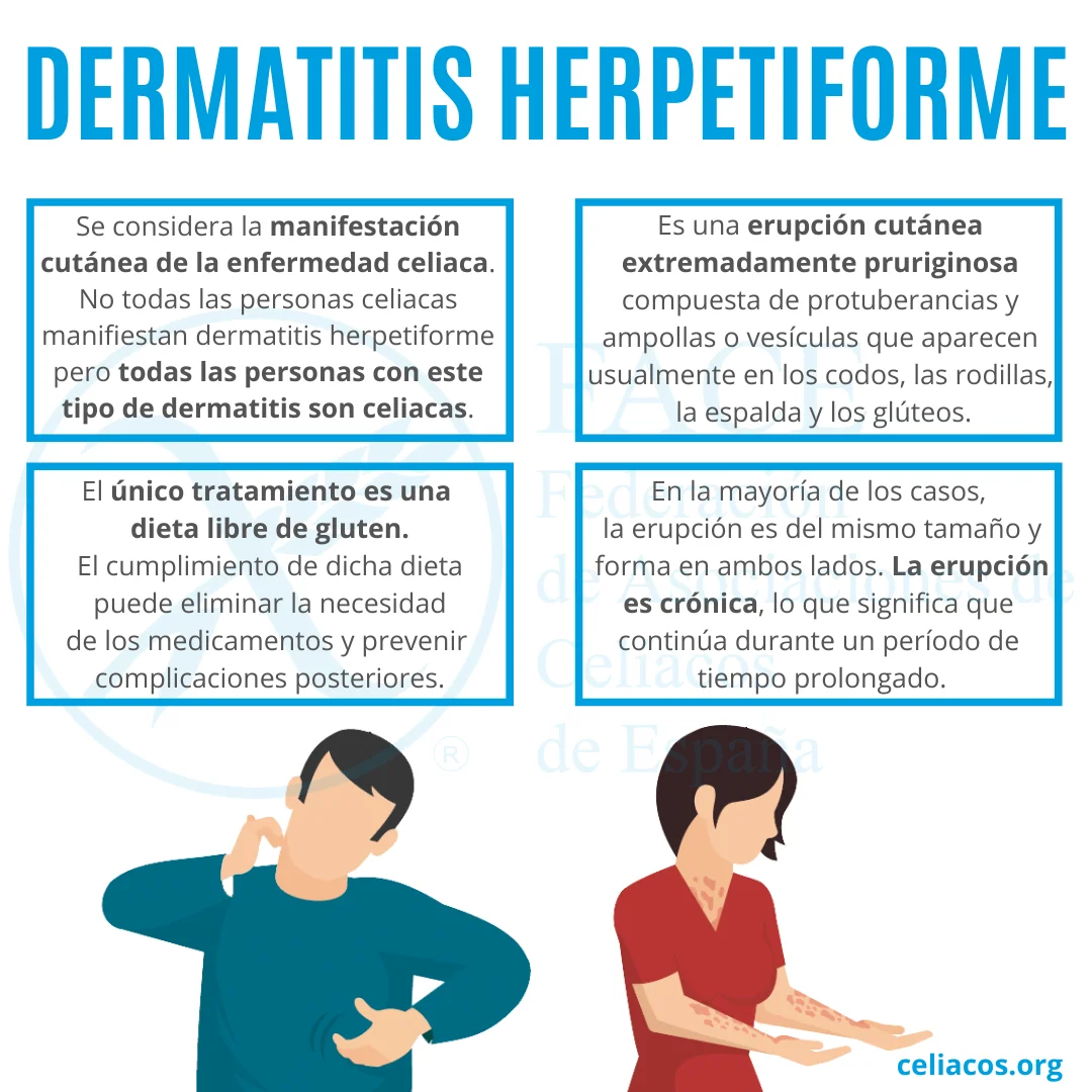 La dermatitis herpetiforme se considera la manifestación cutánea de la enfermedad celiaca. Es una enfermedad ampollosa autoinmune poco frecuente que sufren entre 11,5 y 75 personas de cada 100.000. Se trata de una erupción cutánea extremadamente pruriginosa compuesta de protuberancias y ampollas o vesículas que aparecen usualmente en los codos, las rodillas, la espalda y los glúteos. En la mayoría de los casos, la erupción es del mismo tamaño y forma en ambos lados. La erupción es crónica, lo que significa que continúa durante un período de tiempo prolongado por ello, se puede tratar con dapsona, un antibiótico que puede ayudar a la mayoría de los pacientes cuando sufran brotes puntuales . No todas las personas celiacas manifiestan dermatitis herpetiforme pero todas las personas con este tipo de dermatitis son celiacas.