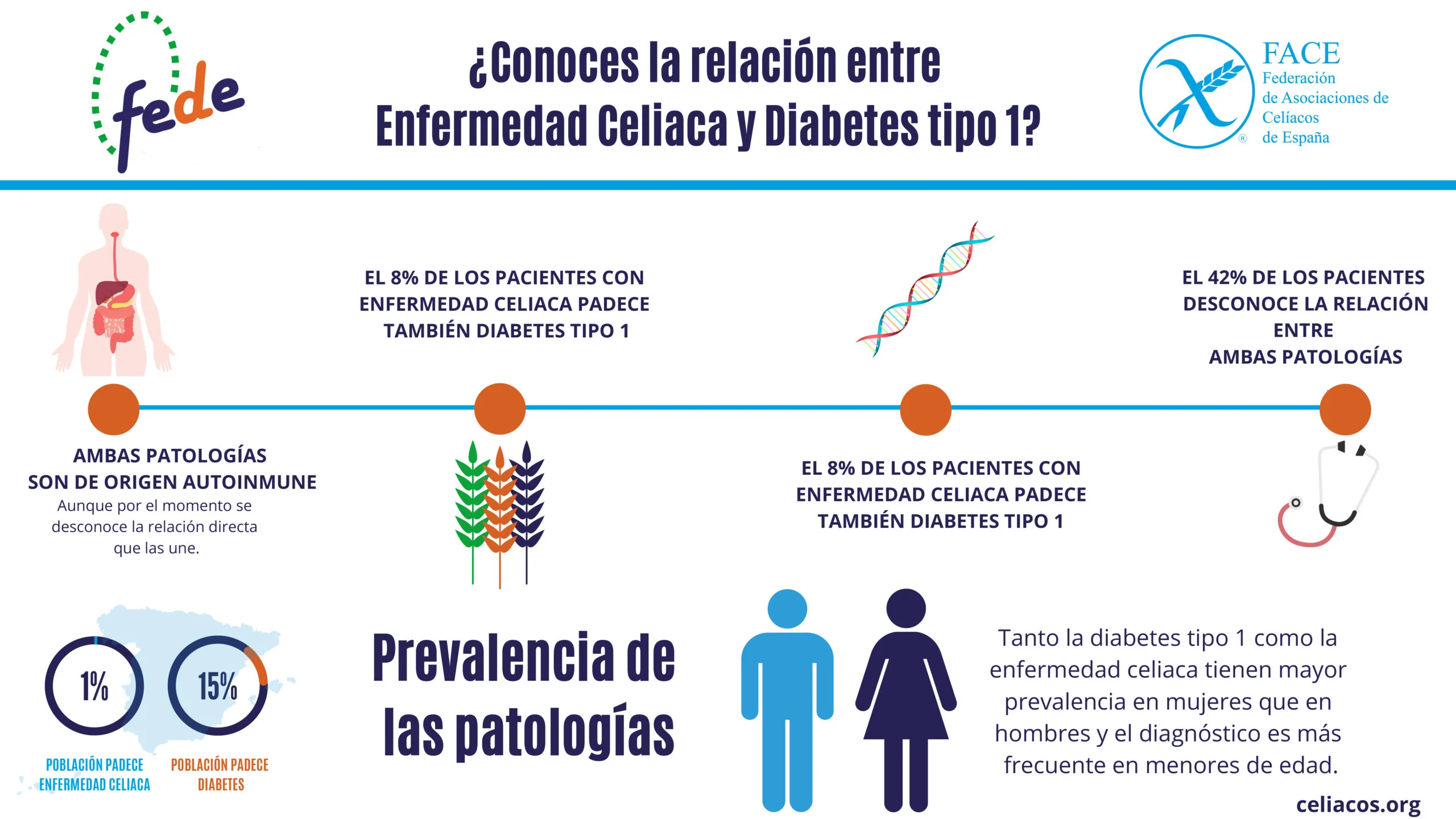 Aproximadamente el 8 % de los pacientes celiacos son diabéticos tipo I (DM I). Además, se ha observado que el 3,5 % de hijos de padres diagnosticado de DM I desarrollan la EC. Por todo ello, es necesario hacer una monitorización mediante pruebas serológicas específicas de EC en éstos diabéticos (Not y col, 2001).