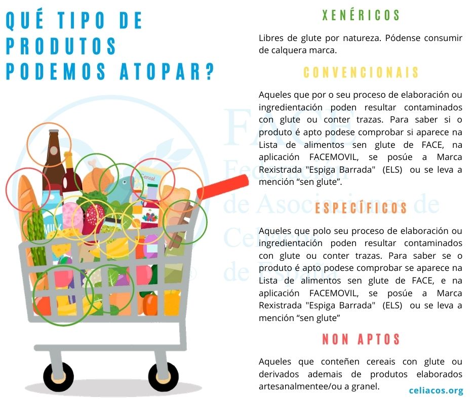 - Específicos: Son os produtos elaborados especificamente para celíacos. Deben ter as certificacións, aparecer na Lista de alimentos sen glute ou en FACEMOVIL ou levar a mención “sen glute”.